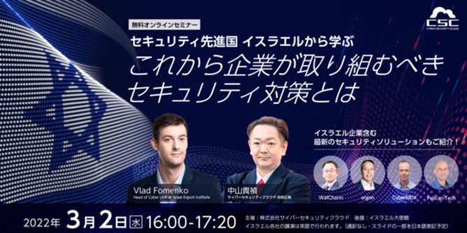 こうした情勢も踏まえ、駐日イスラエル大使館後援で、イスラエル最先端のセキュリティソリューションを展開している、イスラエル企業各社・団体にご協力いただき、「セキュリティ先進国のイスラエルから学ぶ、これから企業が取り組むべきセキュリティ対策」をテーマにしたセミナーを3月2日(水)に開催いたします。日本におけるセキュリティ対策の状況を整理し、先進国に後れを取らないためには、企業としてどのような取り組みを推進していけばよいか、少しでも各企業へお役に立てるような情報をお届けいたします。