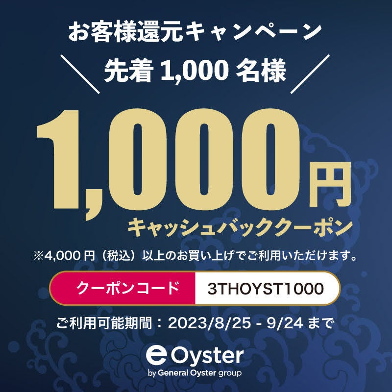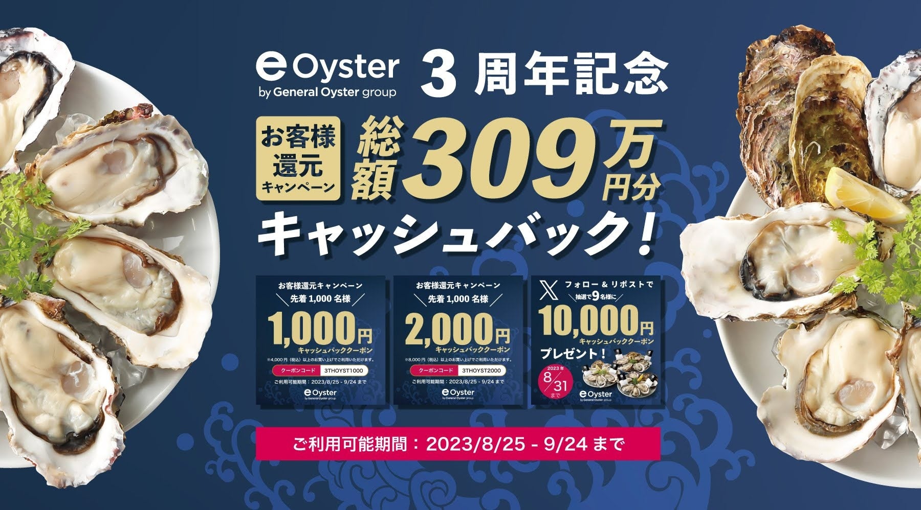 この度、「e-oyster」3周年を記念して、これまでのお客様のご愛顧に感謝する、「総額309万円分」お客様還元キャンペーンを8月25日(金)より9月24日(日)まで開催いたします。「e-oyster」でどなたでも利用できる、1,000円OFFと2,000円OFFクーポンをそれぞれ先着1,000名様分配布します。