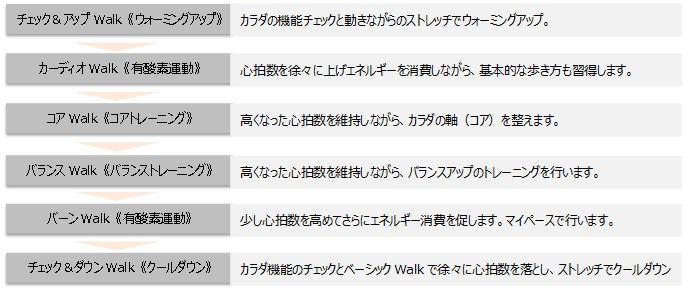 【特徴】 歩く動作をベースに構成。シンプルな動き、キツすぎない強度でどなたでも取り組みやすい。