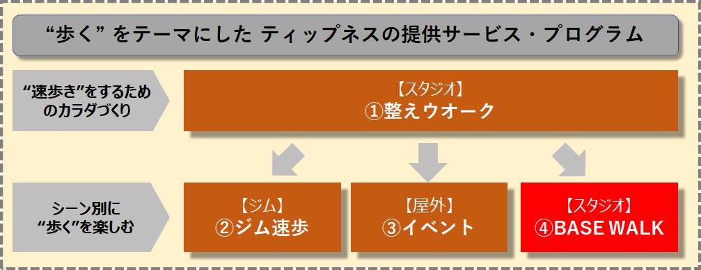 ティップネスでは、誰もが始めやすく続けやすい運動としての “歩く” に着目し、目的別、シーン別にさまざまなサービスやプログラムを提供しています。