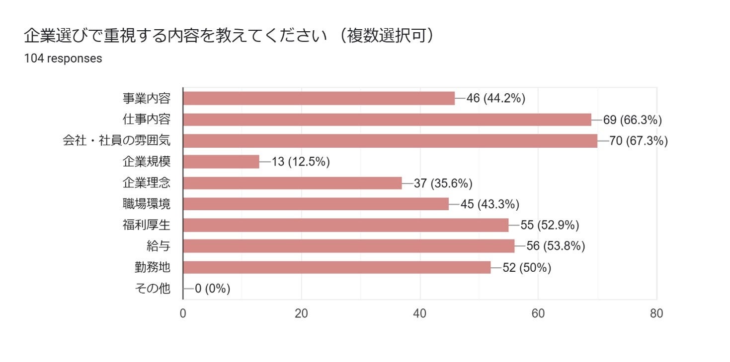 アンケートで回答があった104名のうち、企業選びで重視する内容として「会社・社員の雰囲気」と答えた方が67.3%と最も高く、その次に仕事内容66.3%と続き、給与や福利厚生を上回る結果となりました。自分にフィットした居心地のよい環境で充実した仕事ができることが高い優先順位となることが結果として見えてきました。