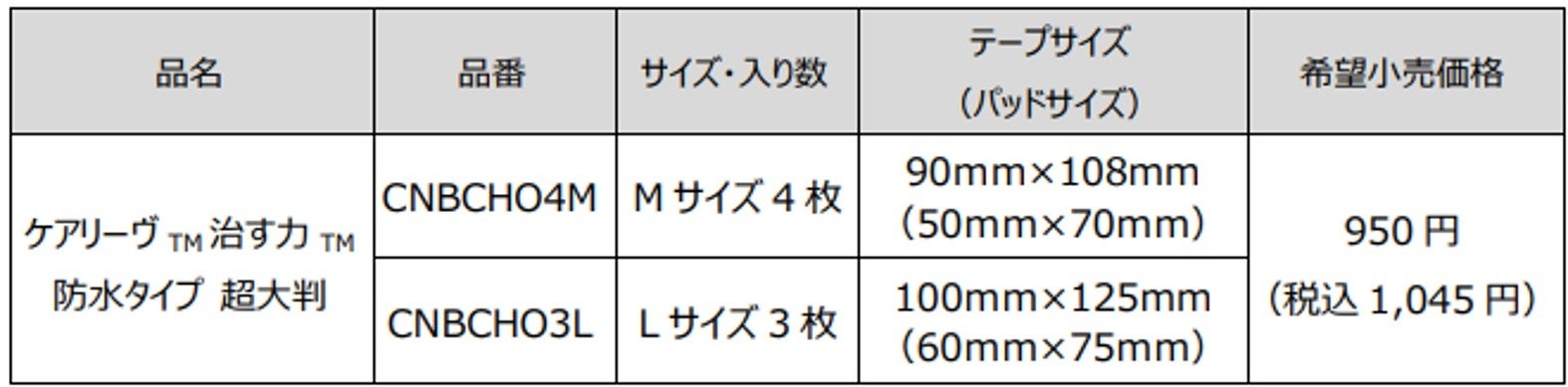 「ケアリーヴ(TM)治す力(TM)」シリーズの「ケアリーヴ(TM)治す力(TM)防水タイプ」は、テープもパッドも透明で目立たず、水仕事やシャワーでもはがれにくい防水仕様の治癒促進絆創膏です。2019年に発売したジャンボサイズの売上が年々伸長していることから、防水で大きなサイズの絆創膏のニーズの高まりを受けて、この度ジャンボサイズより大きな超大判サイズを発売します。ひじやひざといった動きの大きな関節部にもぴったりフィットする透明フィルムが、大きなキズをしっかり防水し、早くきれいに治します。