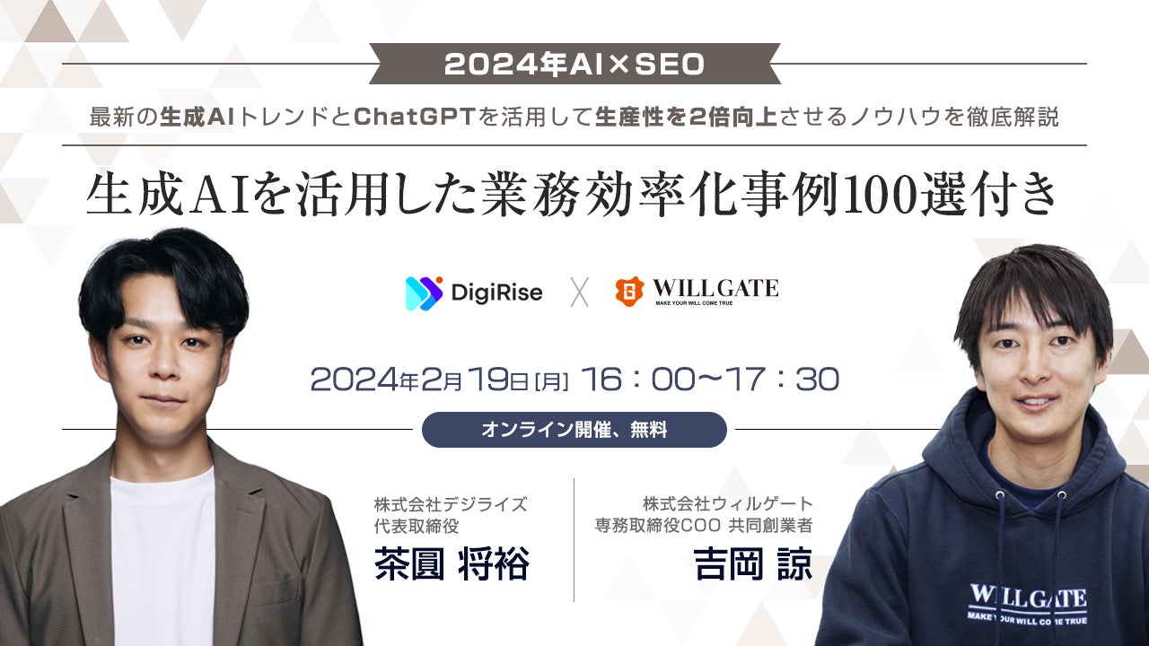 株式会社ウィルゲート(本社:東京都港区、代表取締役CEO:小島 梨揮、以下「ウィルゲート」)は、株式会社デジライズ(本社:東京都渋谷区、代表取締役:茶圓 将裕)と合同で、『【2024年AI×SEO】最新の生成AIトレンドとChatGPTを活用して生産性を2倍向上させるノウハウを徹底解説』をテーマにしたオンラインセミナーを2月19日(月)に開催いたします。(申込み先:https://bit.ly/49ra2Br )