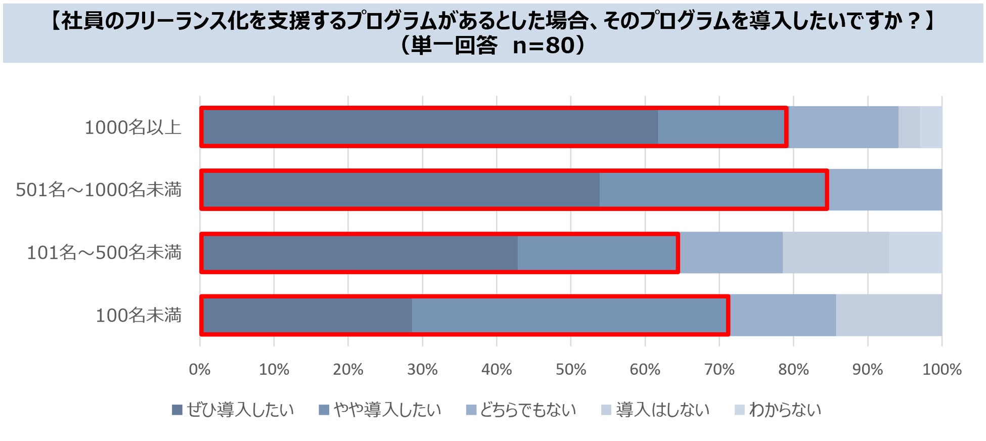 社員のフリーランス化を支援するプログラムがあるとした場合、そのプログラムに対し導入意欲はあるかの質問に対して、企業の規模問わず全体の7割以上の企業が導入を検討したいと答えました。雇用の流動化にあたり、社員のフリーランス化という選択肢に前向きな考え方を持っていることが分かりました。