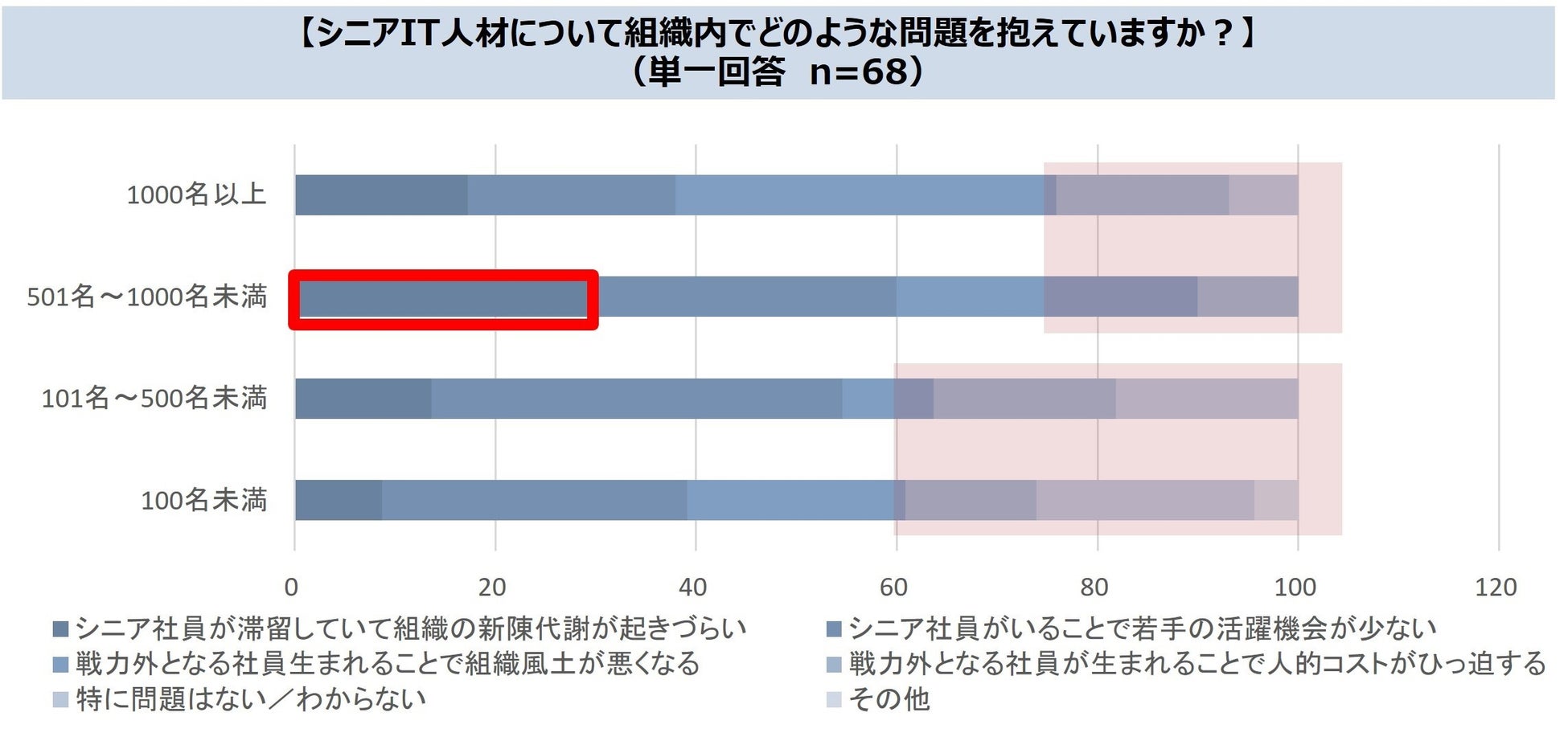 50代以上のシニアIT人材について、企業で抱える課題について質問をしたところ、「社員501~1000名以上の企業」においては、「シニア社員が滞留していて組織の新陳代謝が起きづらい(30%)」という課題が1位に。また、社員500名未満の企業の約3割が、シニアIT人材の活用について「特に問題はない」と回答しているのに対し、社員500名以上の企業については、シニアIT人材の採用に対して、9割以上が何かしらの課題を感じていることがわかった。