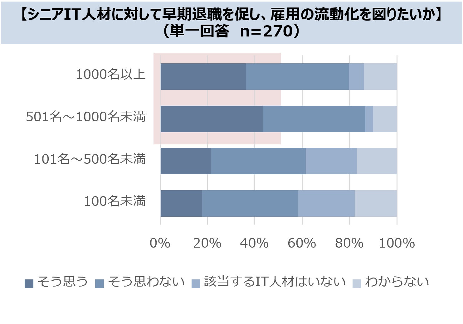 定年退職が迫る50代前半のIT人材について、スキルが高い人たちだとしても、早期退職などにより雇用を流動化を進めたいと思うかという質問に対して、進めたいと回答した割合は【社員1000名以上の大企業】で36% 、【社員500名以上の大企業】で43%、「社員101~500名の企業】で22%、【社員100名未満の企業】で18%となり、大きな会社ほど、雇用の流動化を進めたいと考えていることが分かった。