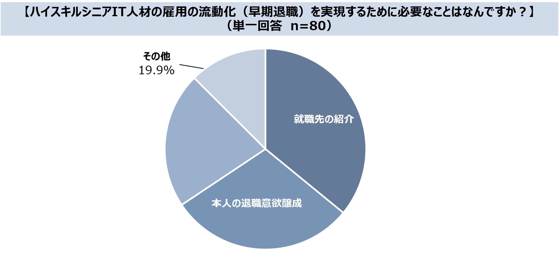 ハイスキルシニアIT人材の雇用の流動化(早期退職)を実現するために必要なことについて質問をしたところ、全体の28.9%が「就職先の紹介」と回答。また、23.8%が「本人の退職意欲醸成」、17.5%が「本人の社外での活躍意欲醸成」と回答し、企業が雇用の流動化を実現するためには、紹介する就職先の確保と、他社またはフリーランスとして活躍する意欲を醸成させる取り組みが必要であることが分かりました。