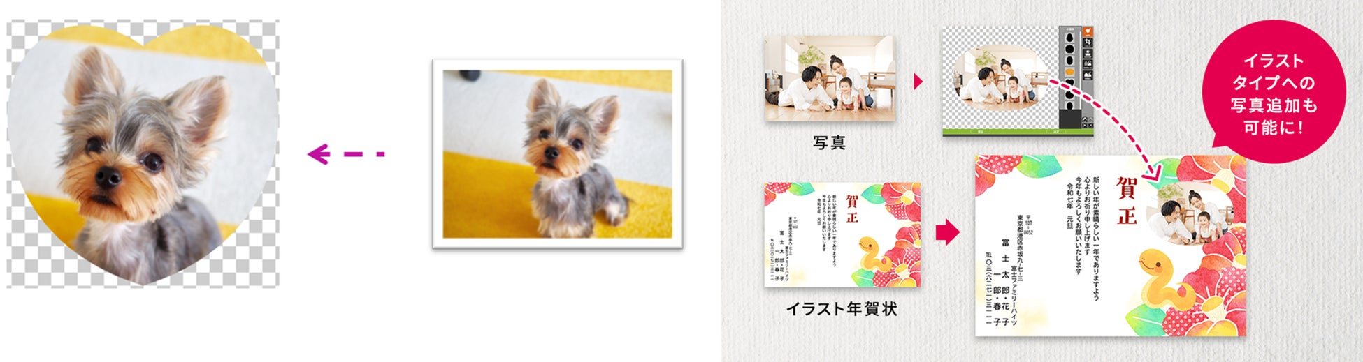写真をスタンプ感覚で使って年賀状を彩れる新機能「写真スタンプ」を搭載。ハートや丸などの形に写真を切り取ったり、AIで背景を自動除去し被写体を切り抜くこと(AI切り抜き)も可能です。これまで写真を追加できなかったイラストデザインの年賀状にも、「写真スタンプ」によって写真を添えることができ、年賀状を通して送り手の想いを届けられます。