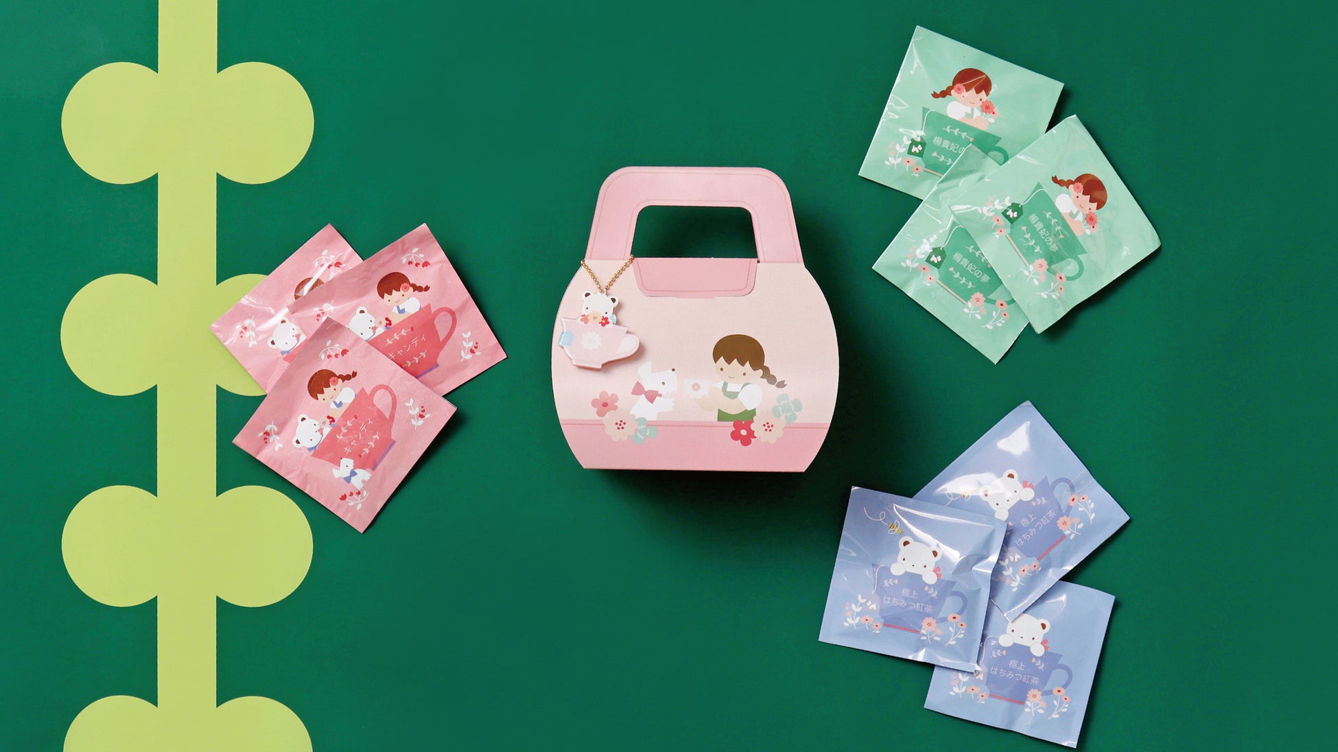 神戸にある紅茶専門店「ラクシュミー」と初のコラボレーションが実現。3種類のティーバッグをオリジナルのパッケージでご用意しました。デニムの生地をイメージしたバッグ型のBOXは、内側がクマちゃんとお花の総柄になっていてとても華やかです。ティーカップの中からお花を持ったクマちゃんがのぞいているチャーム付き。