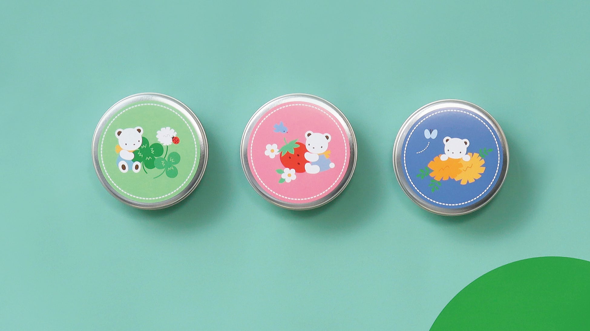 「Botanical Garden」のイメージから、クローバー・ワイルドストロベリー・マリーゴールドの3種類をセレクトし、それぞれの植物とクマちゃんのアートをシールにプリントしました。缶の中で栽培が可能なため、場所を取らずに気軽にお楽
