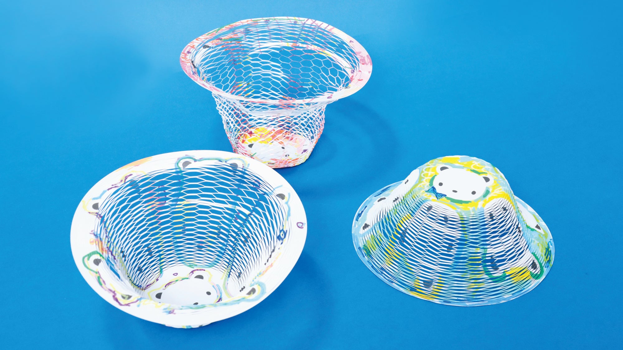 ファミリアのクマちゃんがプリントされたオリジナル柄の「空気の器」が登場。細かい切り込みが入った円形の紙を広げると、平たいお皿や、細長い壺のようになったりと、さまざまなカタチを表現できます。画用紙のような感覚で絵を描いたり、好きな色で彩ってくださいね。小物入れや、花瓶の装飾などインテリアアイテムとして使っていただけます。
