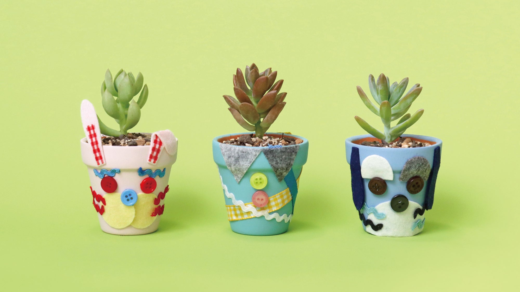 カラフルな植木鉢を、フェルト・リボン・ボタンを使って自由にデザインしてみよう。植木鉢には、千葉県浦安市にアトリエを構える「TOKIIRO」の多肉植物を植えていただきます。鉢植えを2つ作成して、お家に帰ったら別々の場所に置い