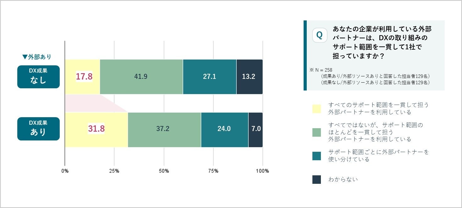DXで成果を出した企業のうち、完全に一貫したサポートを外部パートナー1社から受けている割合は31.8%に上り、成果を出していない企業の17.8%を大きく上回っています。このデータから、パートナーに上流から下流まで一貫してサポートを依頼することが、DXの成果につながる一因だと考えられます。