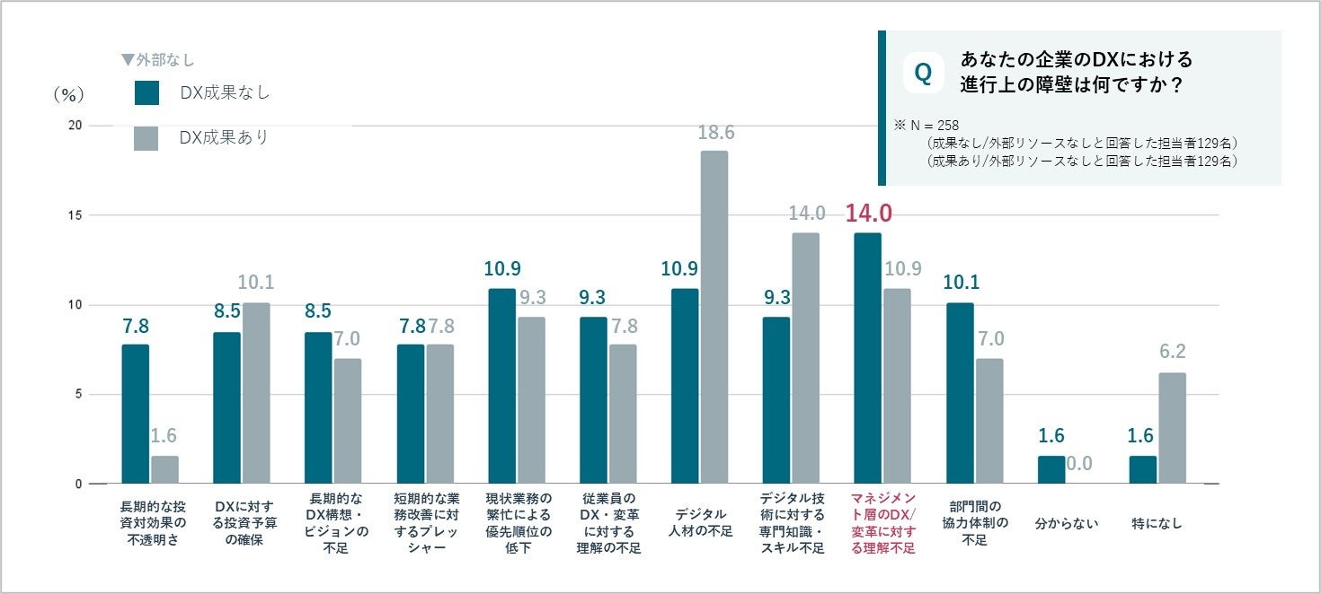 外部リソースに頼らず成果を出せていない企業に、DX推進における進行上の障壁について尋ねたところ、「マネジメント層の理解不足」を課題とする割合が14.0%と最も高くなっています。マネジメント層のDXに対する理解不足が、推進の停滞に影響している可能性があります。