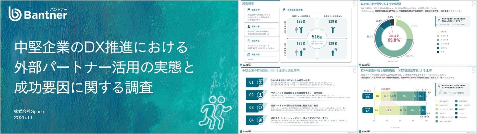 株式会社Speee(本社:東京都港区、代表取締役:大塚英樹、東証スタンダード:4499)の提供する伴走型コンサルティングサービス「バントナー(https://bantner.speee.jp/)」が、日本の中堅企業のDX推進における外部パートナー活用の実態と、その成功要因に関する調査を実施しました。