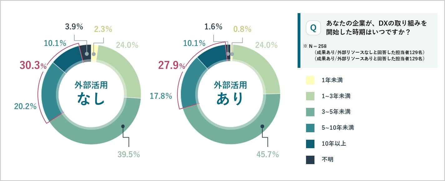 外部リソース活用企業のうち、成果創出に5年以上かかったケースは27.9%と、外部パートナーを活用しなかった企業(30.3%)よりも少ない結果となりました。外部パートナーの活用が、DXの成果創出までの期間短縮に寄与する可能性があると言えます。