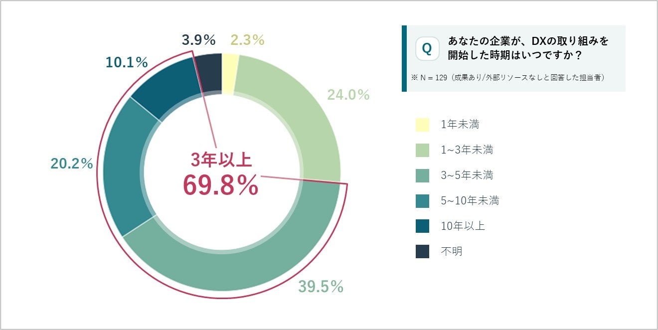 外部リソースなしでDXで成果を上げた企業のうち約7割が、取り組み開始から成果創出まで3年以上の期間を要していることがわかりました。このことから、短期的な視点だけでなく、中長期的な視点での継続が、成果につながる一因であると考えられます。