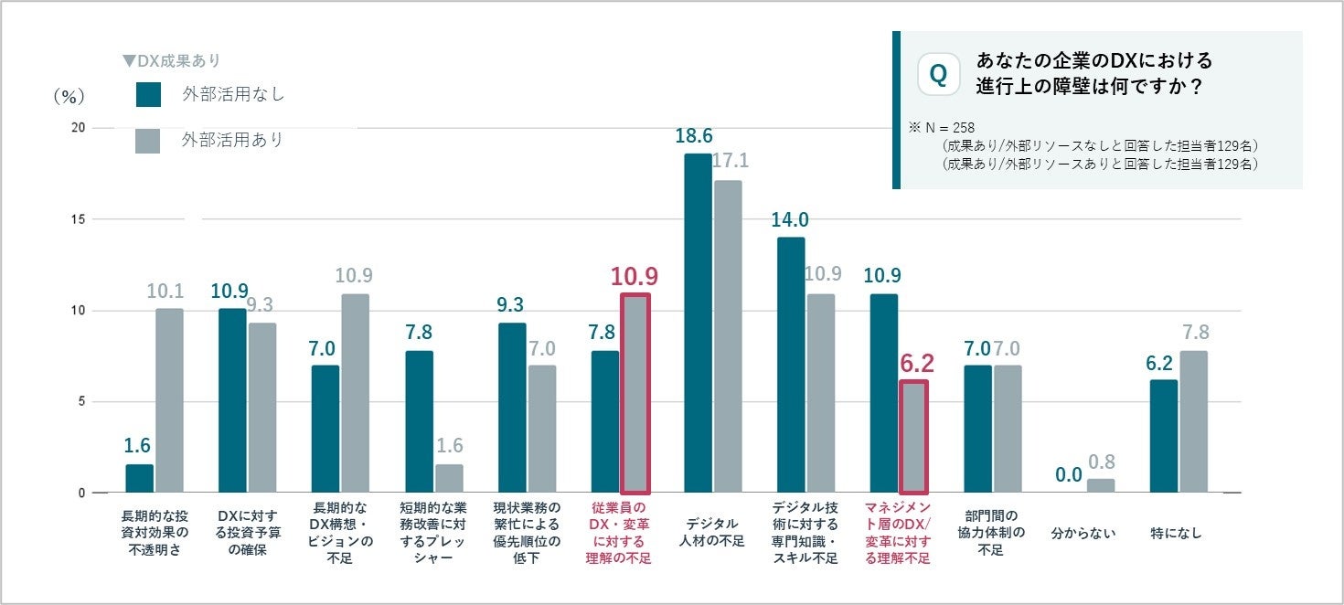 また、外部パートナー活用企業は、マネジメント層の理解不足が少ない一方、「従業員の理解不足」を課題とする傾向が見られます。これは、トップダウンである程度DXが進んだ後、現場の実行フェーズで新たな壁に直面している状況を示唆しています。