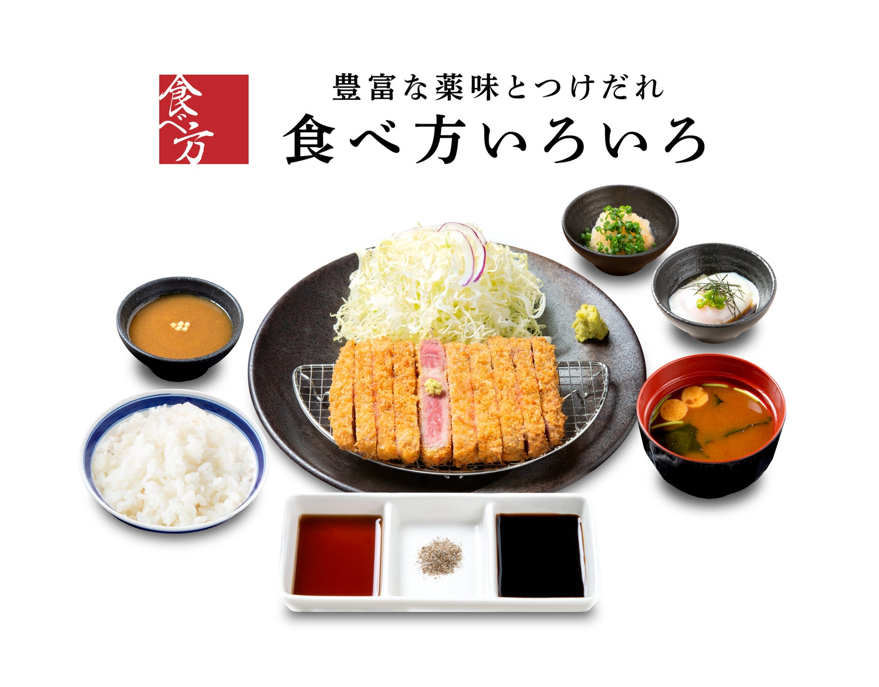 豊富な部位に加え、バラエティ豊かな薬味とつけだれをご用意。こだわりの和風だしをたっぷり効かせただし醤油や特製和風カレーつけ汁、野菜の旨味が溶け込んだ牛カツソース、山椒塩など、牛カツとの相性にこだわり抜いたたれ・薬味から、自分好みの組合せを愉しんでお召し上がりいただけます。