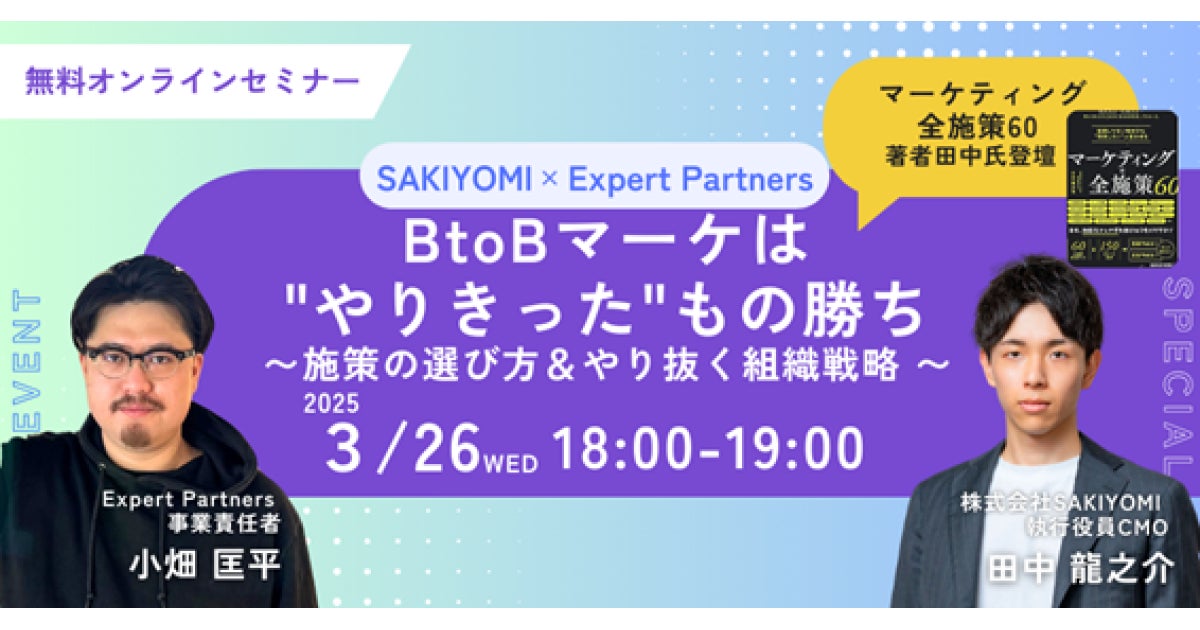 株式会社TWOSTONE&Sons(以下 TWOSTONE&Sons)の100%子会社である株式会社Digital Arrow Partners(所在地:東京都渋谷区、代表取締役CEO:道家康貴、以下 Digital Arrow Partners)は、2025年3月26日(水)に株式会社SAKIYOMI(所在地:大阪府大阪市、代表取締役社長:吉田睦史、以下 SAKIYOMI)と共催でウェビナーを開催することをお知らせいたします。