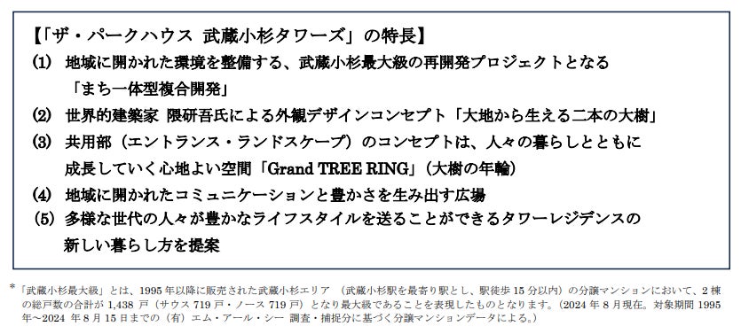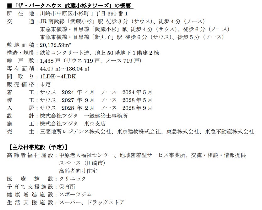 三菱地所レジデンス株式会社、東京建物株式会社、東急株式会社、東急不動産株式会社の4社は、 武蔵小杉駅北側エリアの「まち一体型複合開発」における、武蔵小杉最大級2棟1,438戸(サウス719戸、ノース719戸)の地上50階建、免震タワーレジデンス「ザ・パークハウス 武蔵小杉タワーズ」(以下、「本物件」)の概要を発表します。また、本物件の魅力を紹介する特設サイトを公開し、タワーレジデンスの新しい暮らし方を提案していきます。