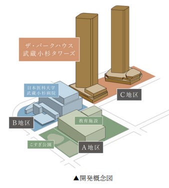 武蔵小杉駅北側エリアの日本医科大学武蔵小杉キャンパスは、「小杉駅周辺まちづくり推進地域構想」の将来都市整備方針において「医療と文教の核」に位置し、大学病院を中心に、医療・教育・都市型居住・商業が複合した高度医療福祉拠点を形成することとしております。A・B・Cの3つの地区での開発が行われ、A地区は教育施設および公園の開発が完了しており、B地区は2021年9月に新病院が開院しています。