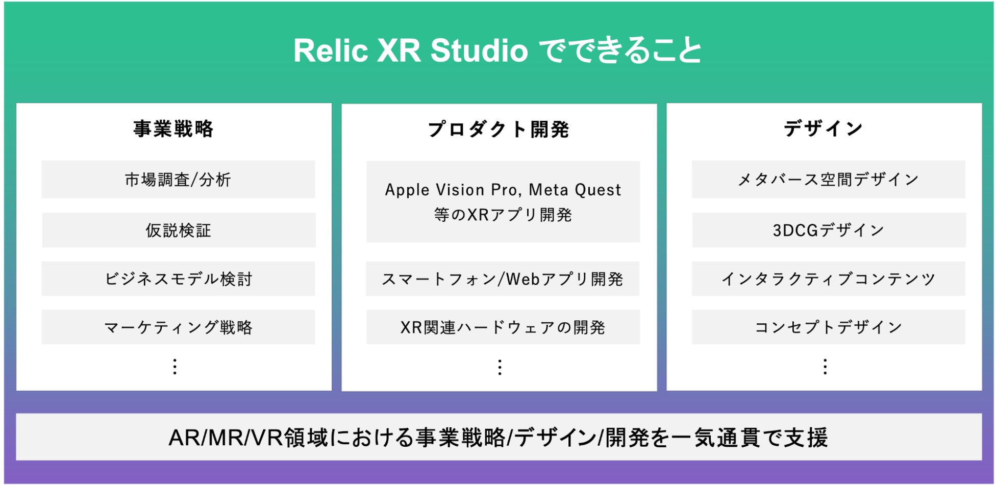 XR領域における新規事業を、アイデア創出からプロダクト開発まで一気通貫で支援します。「Relic XR Studio」では、まずはApple社が提供する空間コンピューティングヘッドセット、「Apple Vision Pro」等のXR Device対応アプリを開発していきます。