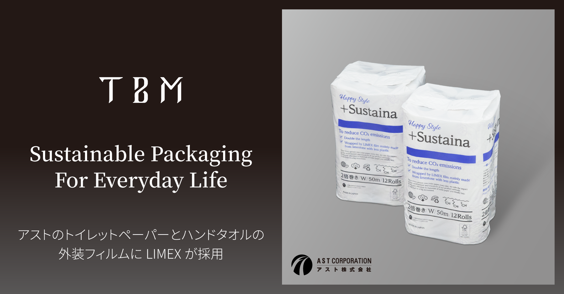 アスト株式会社(本社:大阪府大阪市、代表取締役社長:林裕之、以下アスト)はトイレットペーパーとハンドタオル外装フィルムに、株式会社TBM(本社:東京都千代田区、代表取締役CEO:山﨑敦義、以下TBM)の石灰石を主原料とする「LIMEX Pellet(ライメックスペレット)」(インフレーション成形グレード)を採用しました。トイレットペーパーとハンドタオルの外装にLIMEXを使用する初の事例となります。2022年12月より順次全国のドラッグストア、ホームセンターやディスカウントストアなどの小売店に並ぶ予定です。
