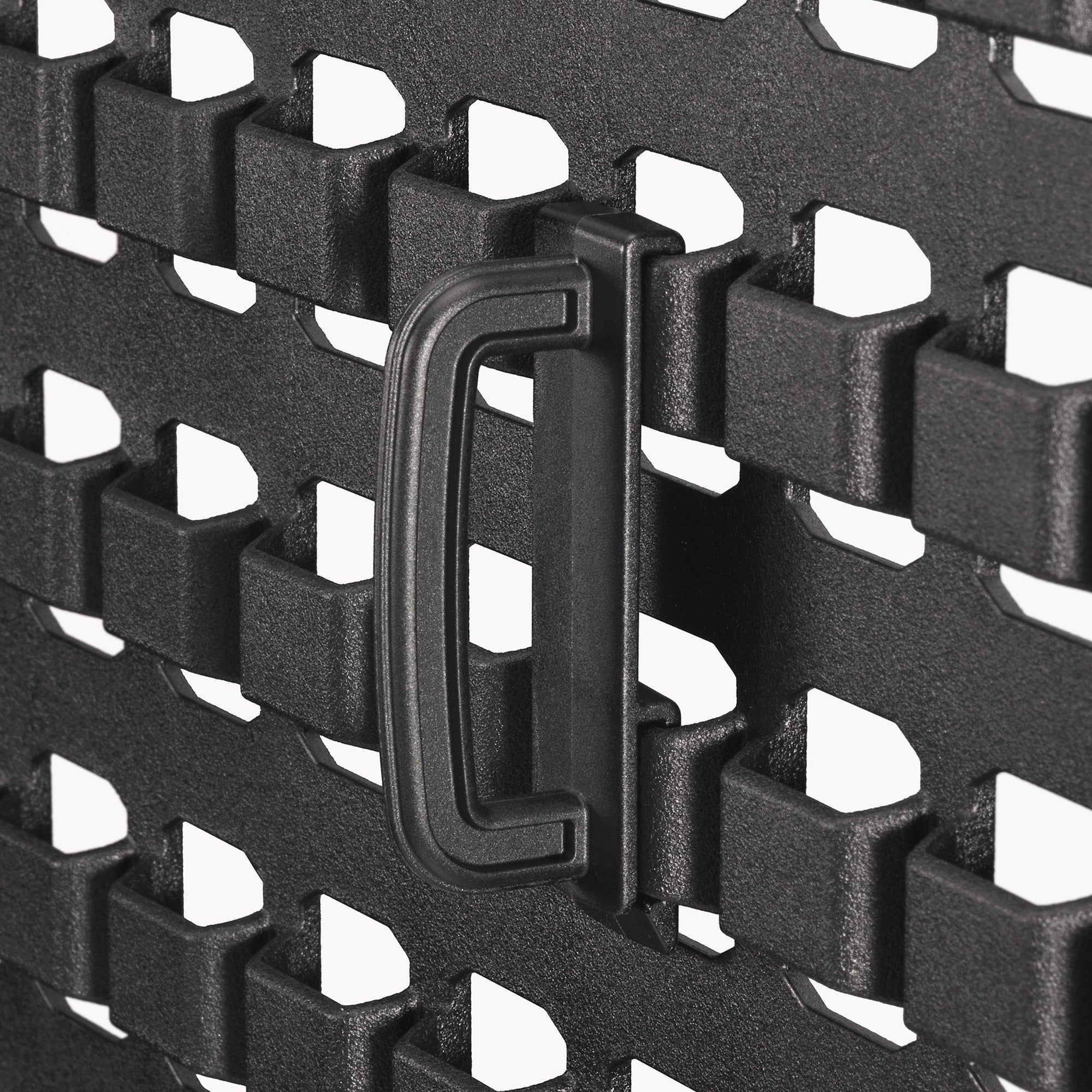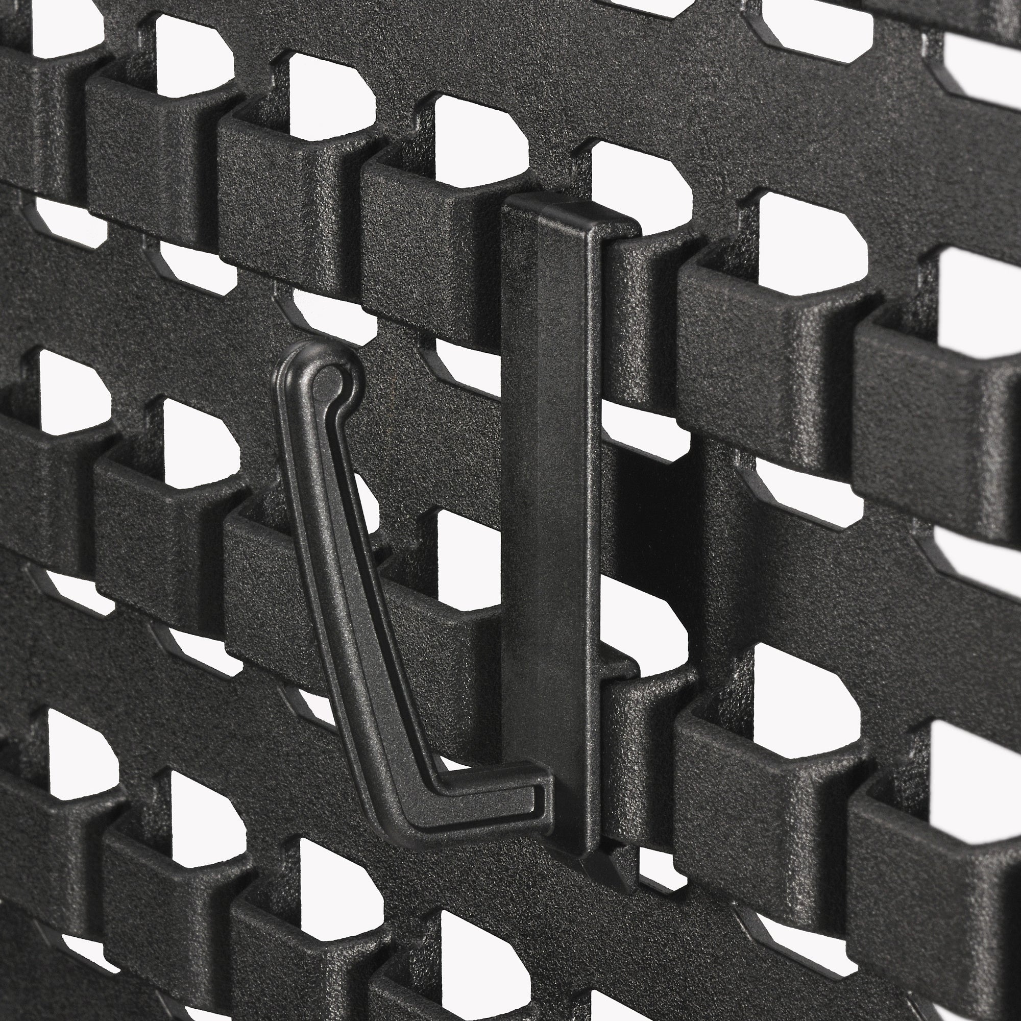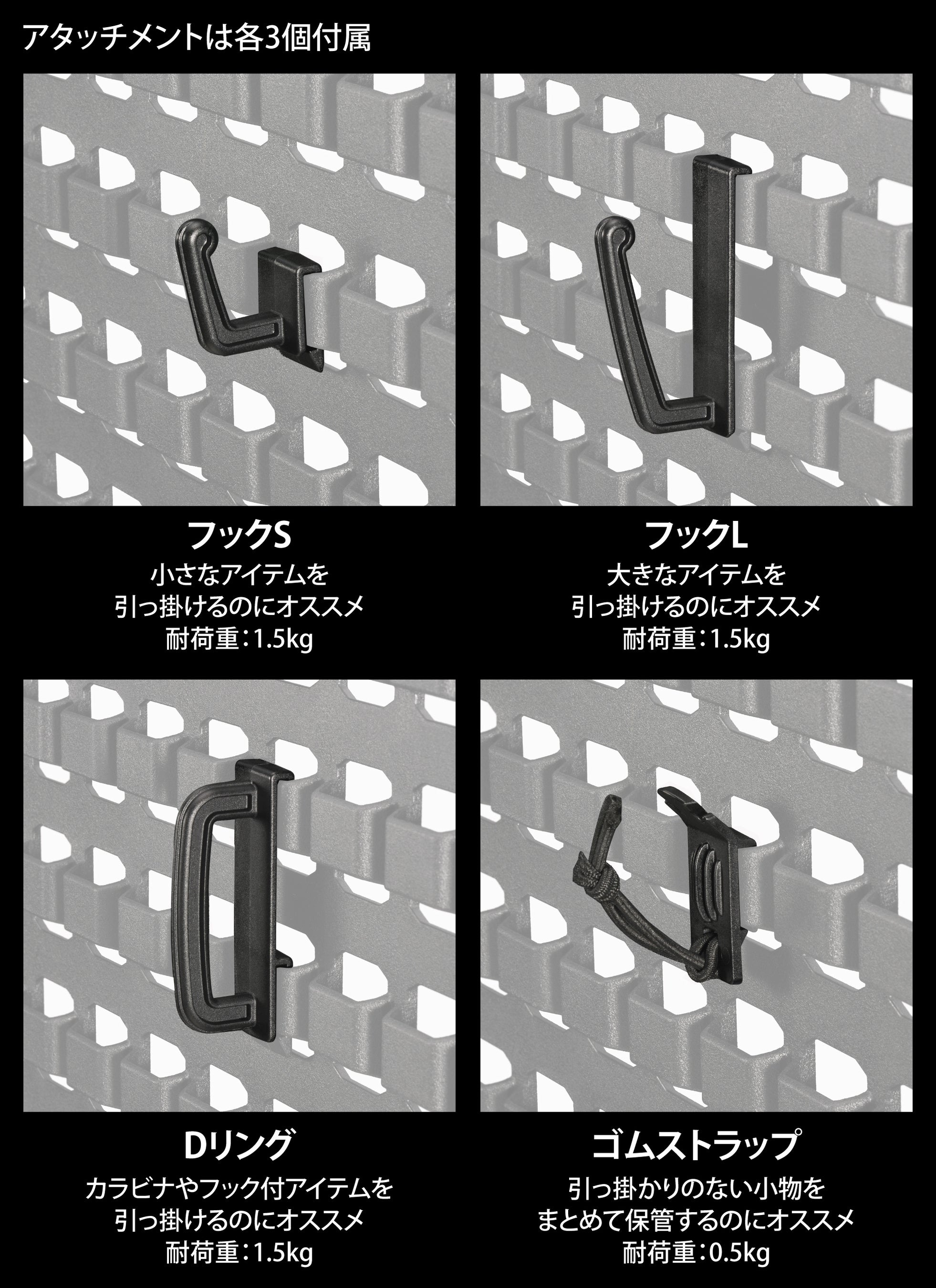 MOLLE(モール)システム対応。凹凸のあるオフセット構造でベルトを通しやすく、モール対応アイテムを自在に取り付けることが可能。4種類の専用アタッチメント付属(各3個ずつ)で、工具や小物、バッグ等を掛けることができる