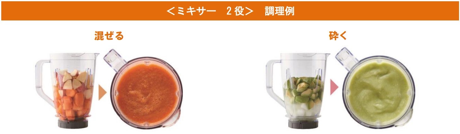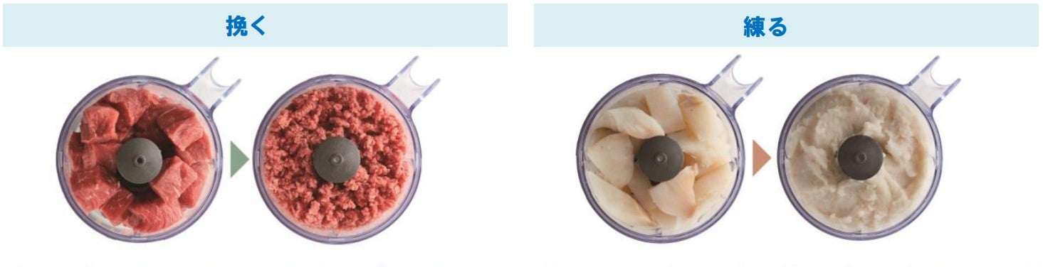 ミキサーで「混ぜる」「砕く」の2役、チョッパーで「混ぜる」「砕く」「刻む」「挽く」「練る」の5役とマルチに使えます。ジュースやスープ、スムージー作りはもちろん、みじん切りやひき肉、すり身やソース作りなど、調理の下準備にも幅広く活躍します。調理効率を上げるだけでなく、手間のかかるみじん切りもボタン一つで完了! 自家製ドレッシングやハンバーグのタネなどもラクに作れるので、毎日の料理が楽しくなります。