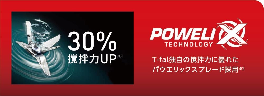 ティファール独自の攪拌力に優れた「パウエリックスブレード(※)」を採用し、従来品と比較して攪拌力が30%アップ。固い素材も均一に攪拌する強靭なブレードが、氷やナッツなどを細かく粉砕し、すり身やポタージュ作りでは食材をしっかりと攪拌し、なめらかな舌触りに仕上げます。