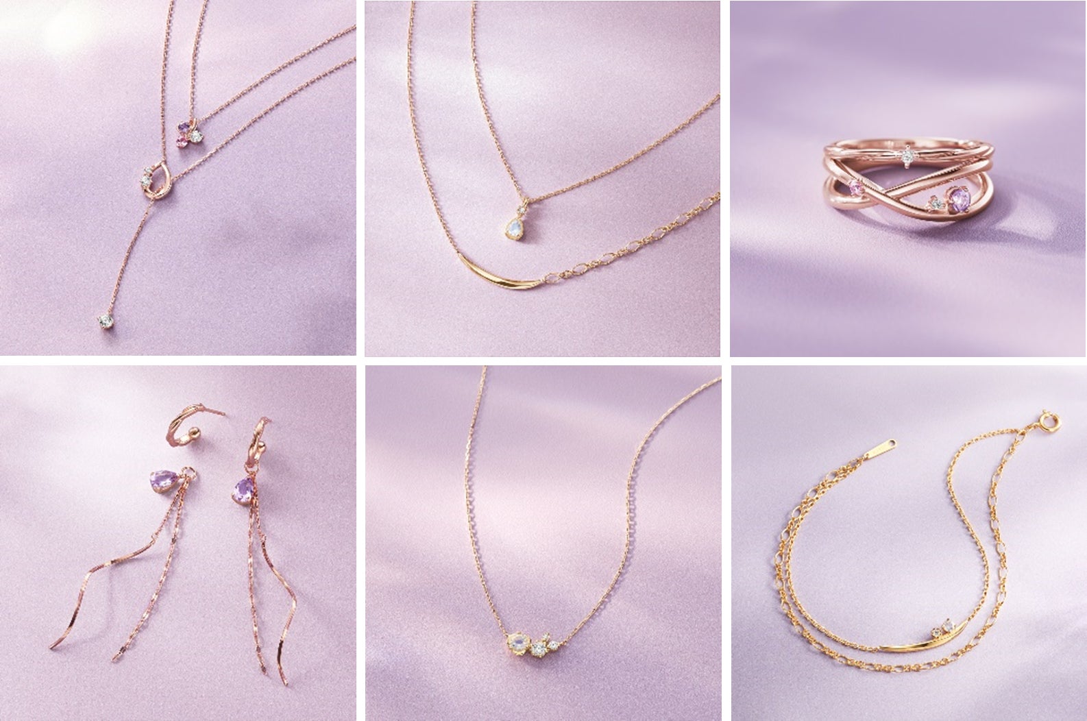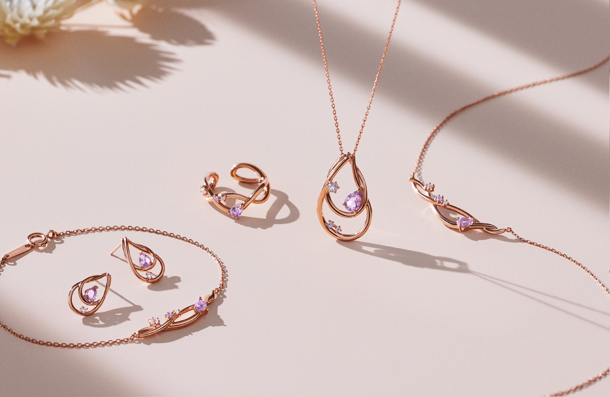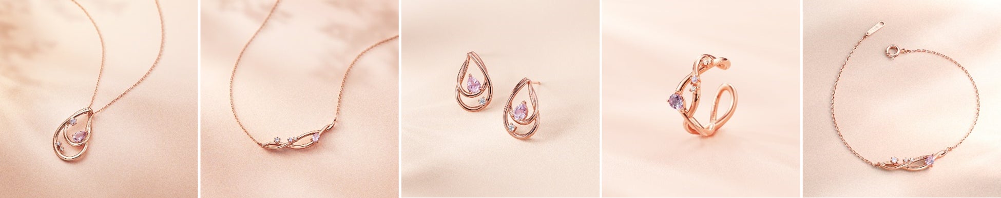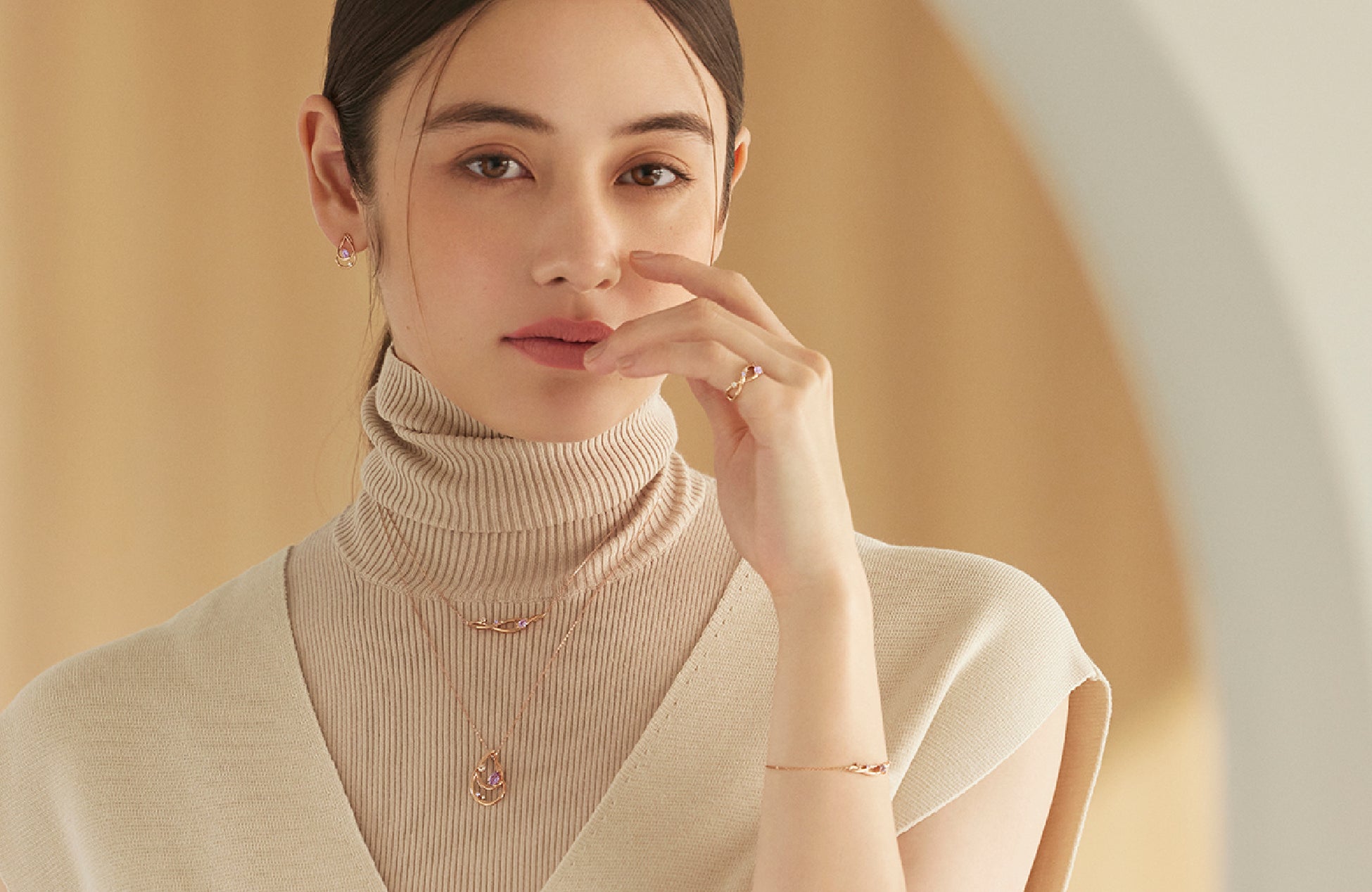 夏の終わりを感じさせる涼しさを纏った秋風を、ピンクゴールドの地金とピンクアメシストの組み合わせで柔らかに表現したシリーズ。優しく重なり合う地金のラインに、澄んだ空気を包み込む秋風のたおやかな動きを映しました。優しい輝きが特徴のピンクアメシストの他に、色のグラデーションが美しいフェルスパー、ラベンダーやクリアのキュービックジルコニアをランダムに留めることで軽やかさを表現したネックレスやブレスレットは、角度によって繊細に輝き、装いを明るく彩ります。