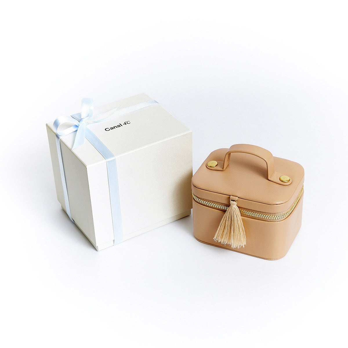 色づく秋の葉を連想するようなオレンジベージュカラーのジュエリーボックスにお入れしてお渡しいたします。
