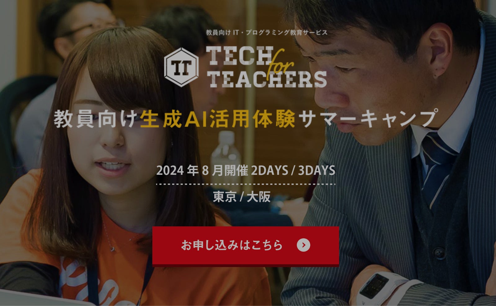 中高生向けデジタル教育を中心に次世代人材の育成を手がけるライフイズテック株式会社(本社:東京都港区、代表取締役CEO:水野 雄介)は、教員を対象とした生成AI研修プログラム「TECH for TEACHERS CAMP 2024」を東京・大阪にて8月8日(火)から順次開催します。