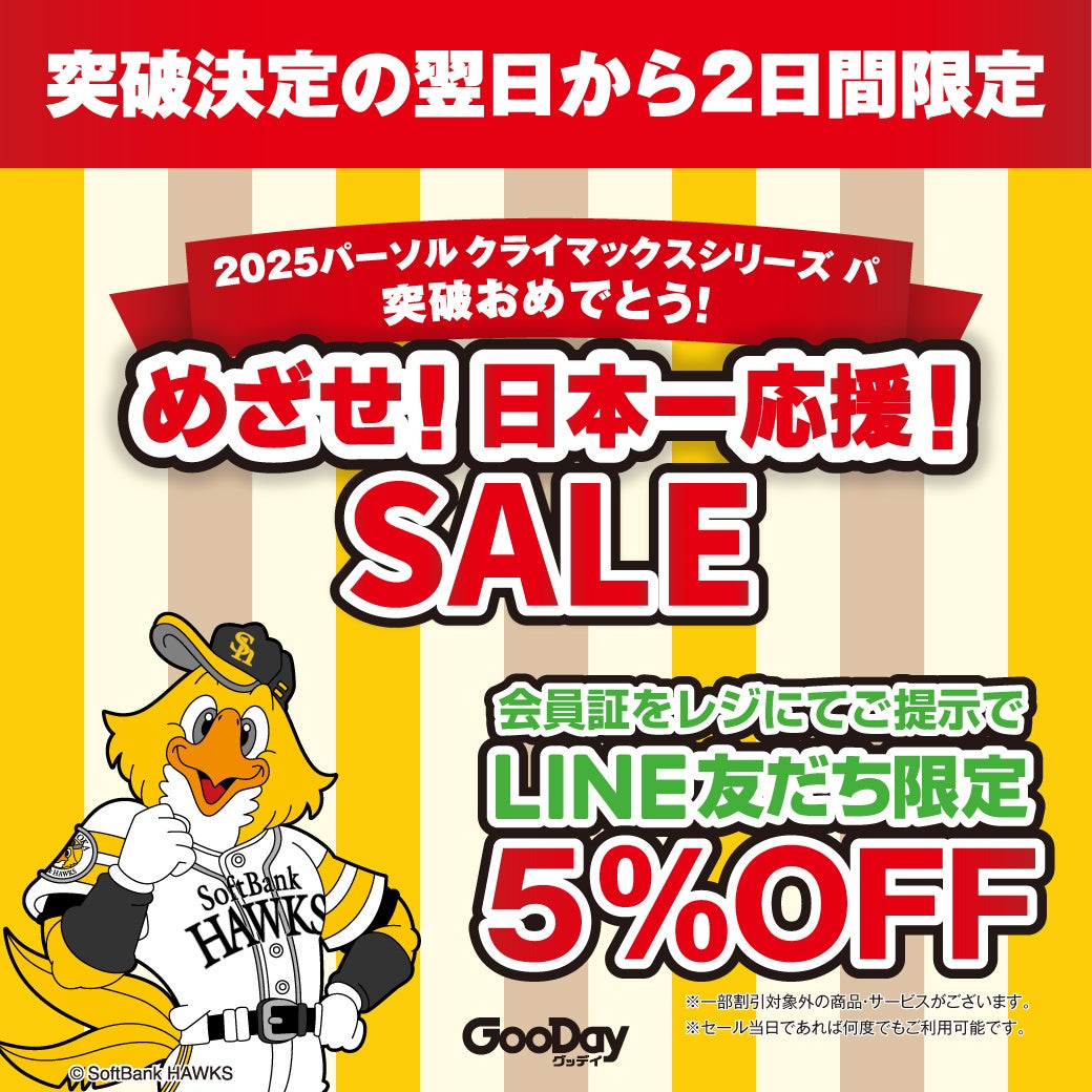 北部九州・山口等に67店舗のホームセンター「グッデイ」を運営する株式会社グッデイ (本社:福岡市中央区 代表:柳瀬隆志) は、福岡ソフトバンクホークスの<2025パーソル クライマックスシリーズ パ>突破を記念して、『福岡ソフトバンクホークス めざせ!日本一応援!SALE』をグッデイ全65店舗にて10月21日(火)・22日(水)の2日間限定で開催いたします。