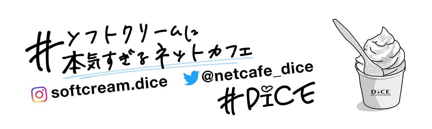 「DiCE」 は、2000 年より関東を中心に展開しているインターネットカフェです。高級感や清潔感などから、多くの女性のお客様にもご好評を得ています。豊富な雑誌・コミック、フリードリンクに加え、ソフトクリームに関しては「ソフトクリームに本気すぎるネットカフェ」として毎月違う味の提供や、他社とのコラボも行っています。