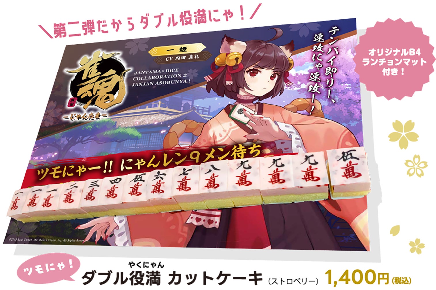 ダブル役満カットケーキは、B4サイズのランチョンマットと選べる3種のソース(ストロベリー・チョコ・キャラメル)付き。
