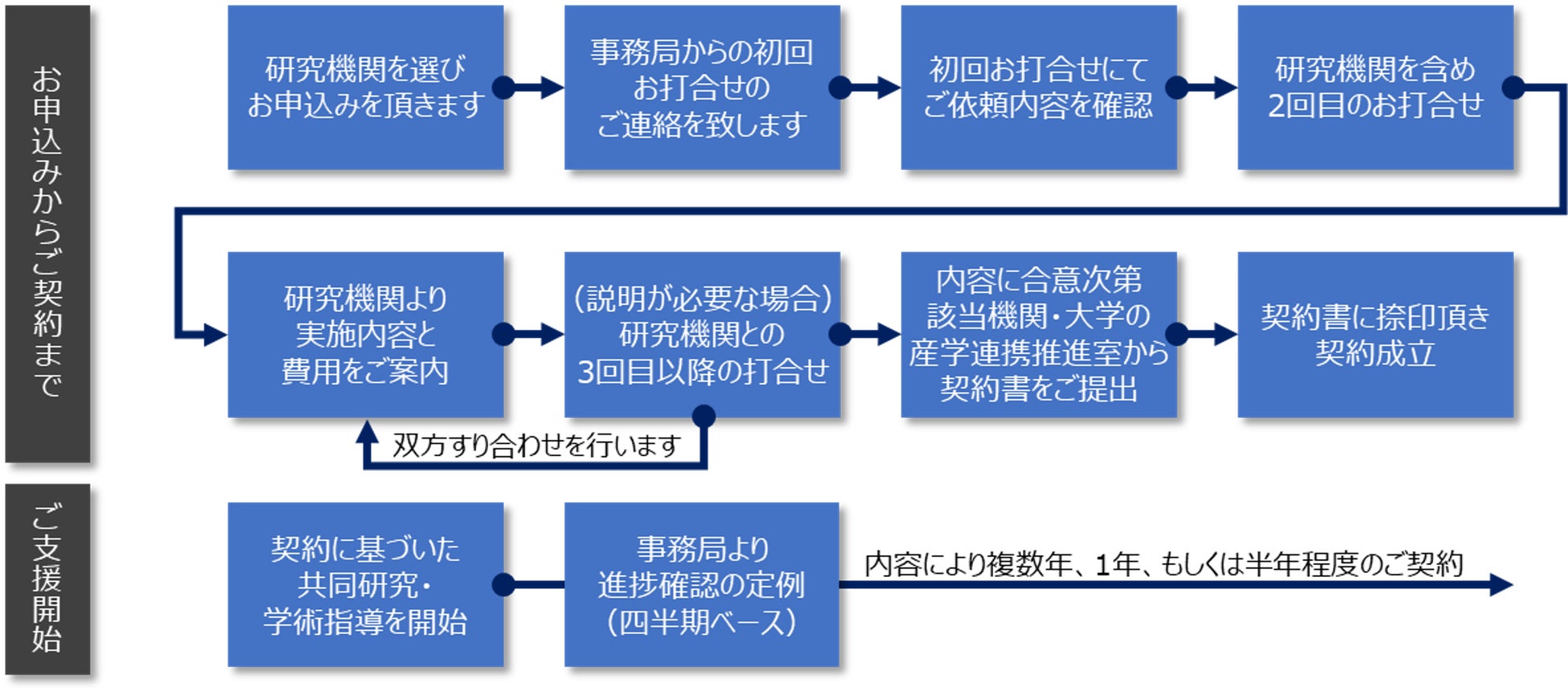 参加方法は、DXイノベーションコネクト(URL:https://dx-innovation-connect.com/ )にアクセスし、大学・研究機関の専門技術や実績を確認し、お問合せフォームからお申込み頂けます。お問合せ頂くとDXイノベーションコネクト事務局からご連絡をさせて頂き、ご相談内容を確認のうえ、最適な研究機関との連携とお打合せを行います。相談内容に応じ、当該研究機関から共同研究・学術指導の実施内容と費用をご案内します。相互に合意された場合、該当機関・大学の産学連携推進室と直接契約を結び、企業DX PoC支援を開始できます。