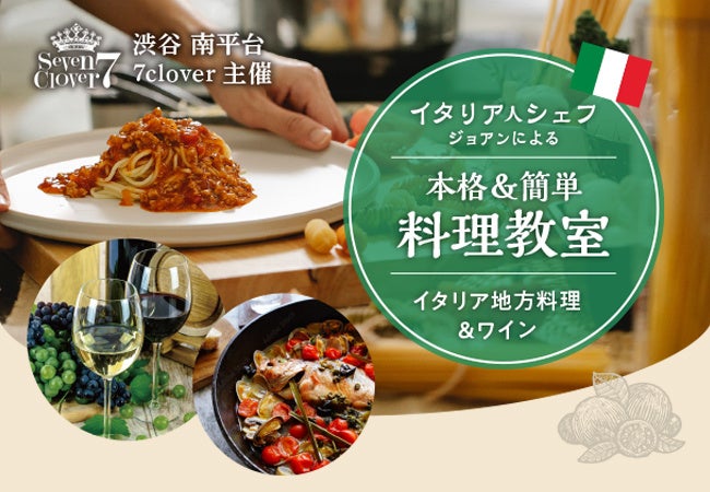 渋谷・南平台の隠れ家レストラン「7clover(セブンクローバー)」のイタリア人シェフ・ジョアン直伝のイタリアの名物料理のレシピとそれぞれの地方のワインについて楽しむ料理教室です。