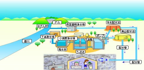 高台にある配水池というタンクで大量の水道水をたくわえることで機器の故障や停電時に対応でき、安定給水が確保されます。水道水はこの配水池から自然流下方式で重力を利用して配水管を通って、みなさんの家庭や工場などに給水されます。