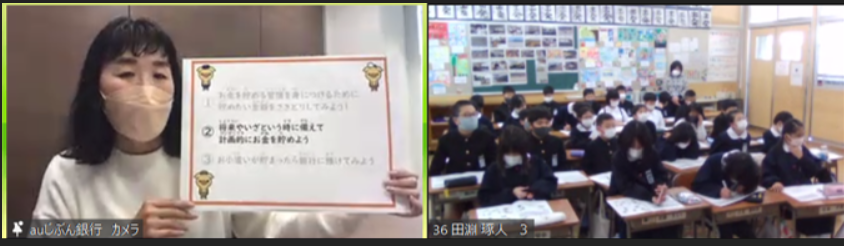 auじぶん銀行「夢の教室」は今回が第3回目の開催となり、寄島小学校の5年生1クラスに向け、「夢の教室」とともに「お金の授業」(以下 本授業)をオンライン形式で実施しました。本授業では、子どもに向けた金融教育コンテンツとして作成した「auじぶん銀行劇場 金融昔ばなし」(https://www.jibunbank.co.jp/corporate/news/2020/1005_01.html)を教材とし、動画を通じて「先取り貯金」「計画的にお金を貯める大切さ」などについて学んでもらいました。