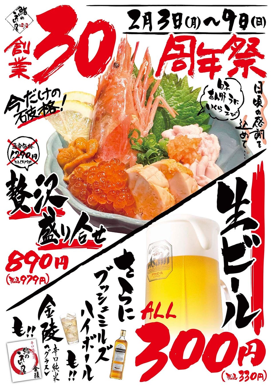 海鮮居酒屋「えん屋」30周年祭!2月3日(月)~ 2月9日(日)開催いたします
