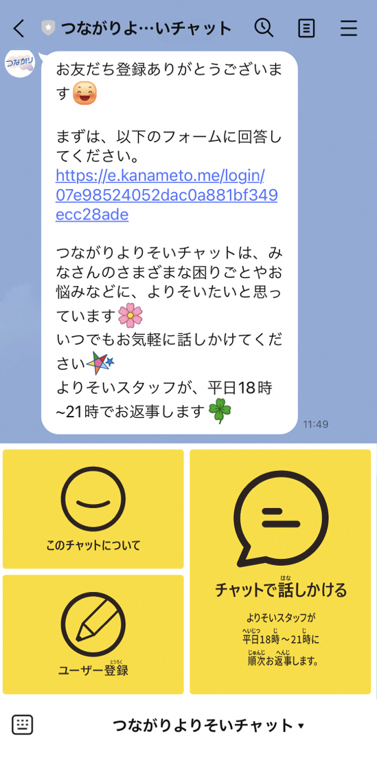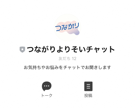 | ご利用方法 | LINEアカウント「つながりよりそいチャット」を友だち登録して、話しかけてください。 相談は無料で、匿名でご相談可能です。 →「つながりよりそいチャット」への相談は以下URLから https://florence.or.jp/lp/yamagata-tsunagari-yorisoi/?page=1 ※LINE IDで検索する場合、「@733gquft」と検索ください。 山形市と認定NPO法人フローレンスにより、WEBやLINEを通じてのご案内や、市内でのチラシポスティング等にて山形市内に広くお知らせしていきます。 |
