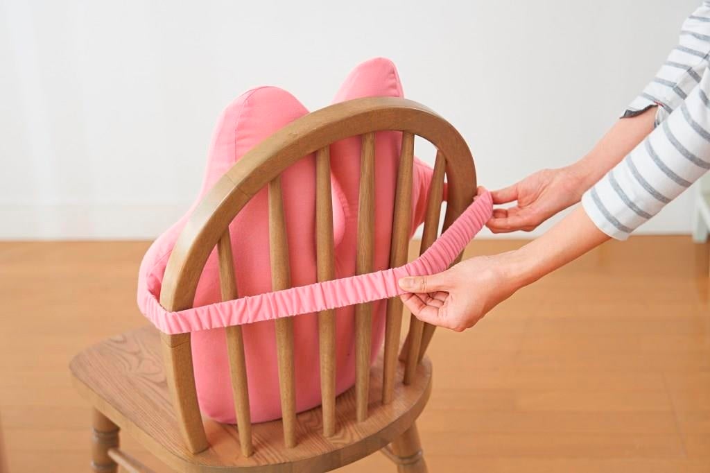 ●背面には椅子に固定できるベルト付。伸縮性のあるゴム仕様なので着脱もラクラク!