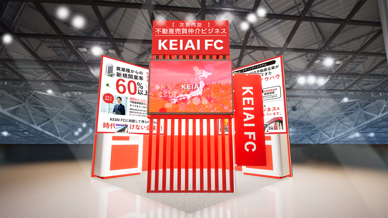 KEIAI FCのブースでは、当社の創業以来30年超の中で培ってきた店舗運営・集客・販売ノウハウと不動産業開業の基礎知識と市場を読み解く力、そして新規開業でも安定した収益を得るためのノウハウの詰まった『KEIAI式・次世代型不動産売買仲介ビジネス』をご紹介します。