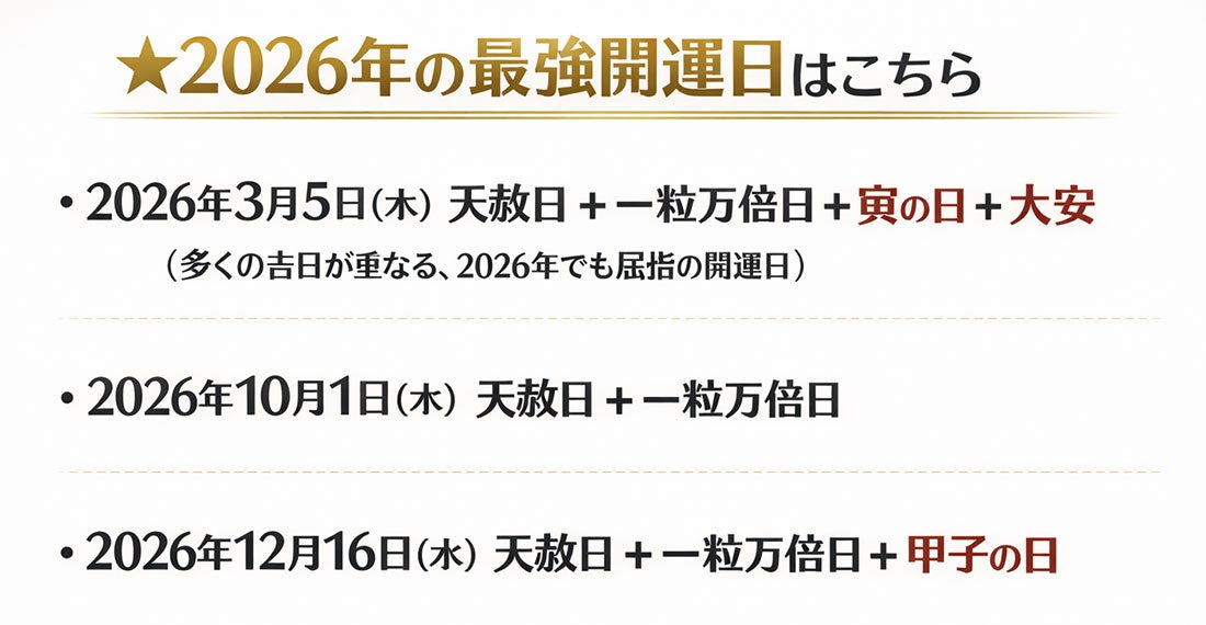 春財布と重なる期間でとくにおすすめの開運日は「2026年3月5日 天赦日 + 一粒万倍日 + 寅の日 + 大安」です。