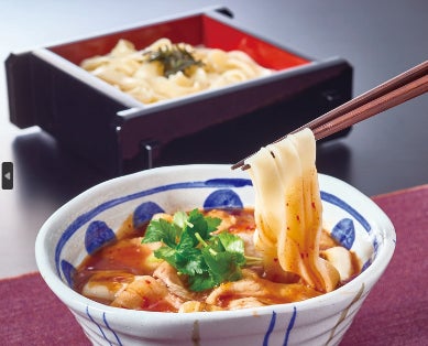 九州産の黒豚に自社工場製の赤ダレの辛味とそばつゆの甘味が合わさったつけ汁と、自社工場製のきしめんが絡まり、クセになる逸品です。