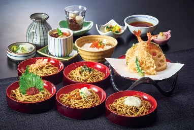 満天そばを、多彩な薬味で食べれる贅沢な御膳。揚げたての天ぷらにいくらご飯・茶碗蒸しがつき、更にデザートもついたフルセット。