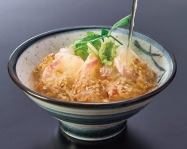 愛媛県産活〆真鯛を使用ており、一杯目は特製ごまだれで、二杯目は出汁と薬味でお茶漬けに。ごまの香りが際立つ、濃厚な味わいです。