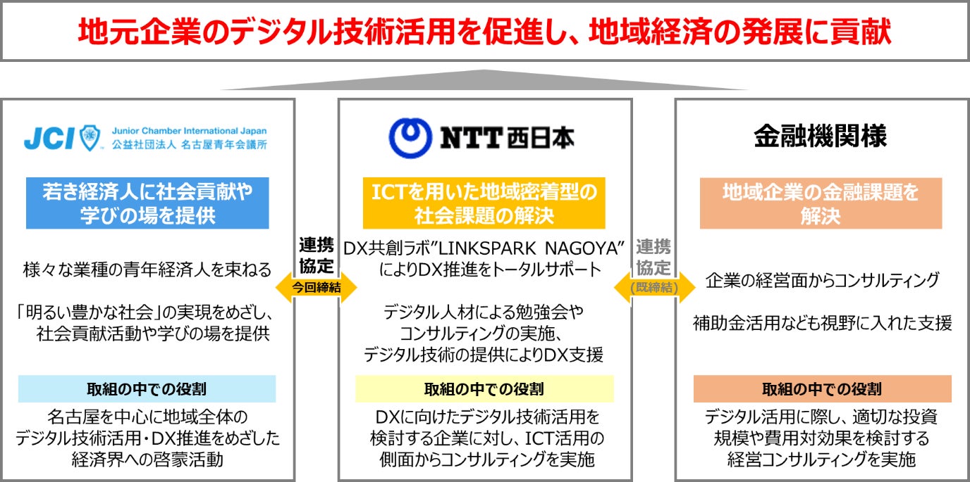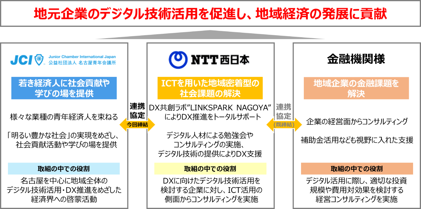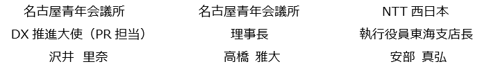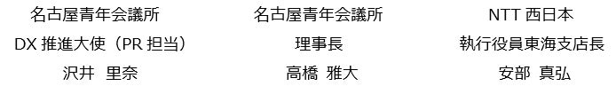 公益社団法人名古屋青年会議所(理事長 高橋 雅大、以下「名古屋青年会議所」)と西日本電信電話株式会社 東海支店(執行役員東海支店長 安部 真弘、以下「NTT西日本」)は、愛知県名古屋市内を中心とした地元企業のDX推進に向けて、下記の通り連携協定(以下、本連携協定)を本日締結いたしましたのでお知らせします。